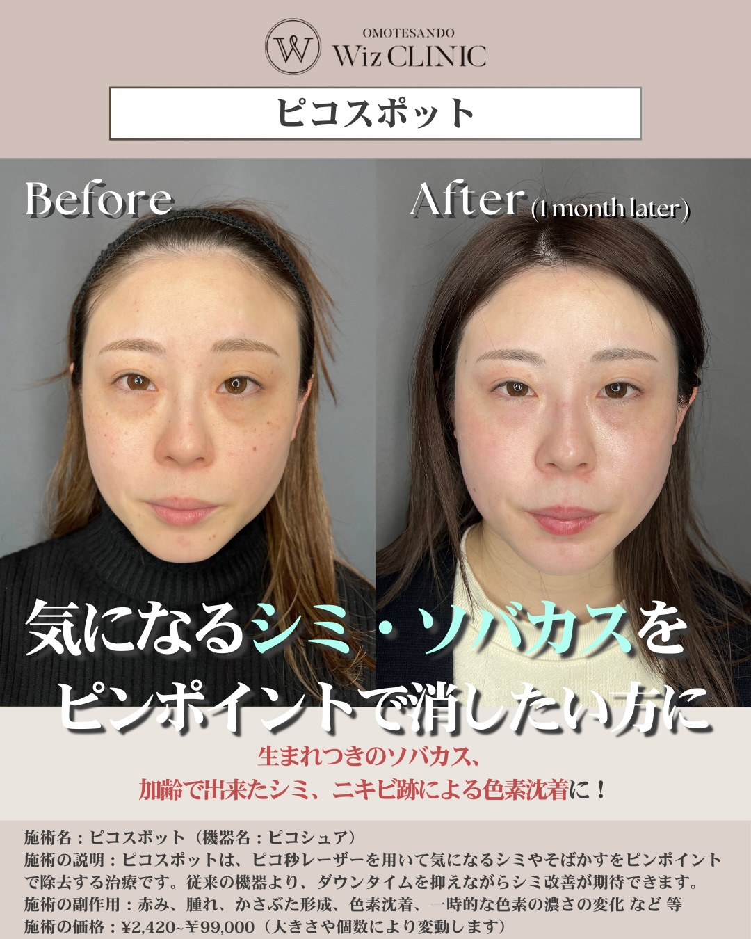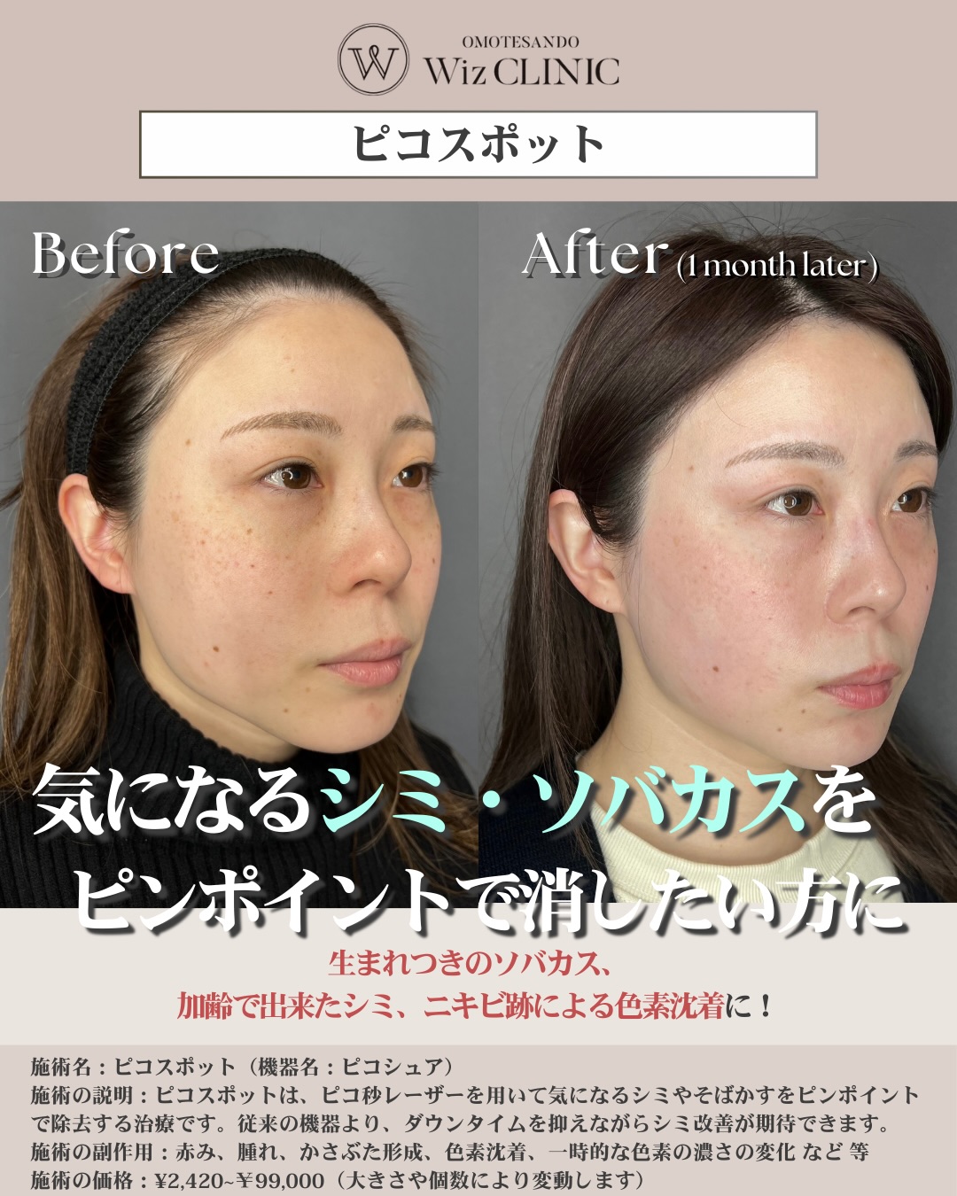 施術の説明:ピコスポットは、ピコ秒レーザーを用いて気になるシミやそばかすをピンポイントで除去する治療です。従来の機器より、ダウンタイムを抑えながらシミ改善が期待できます。