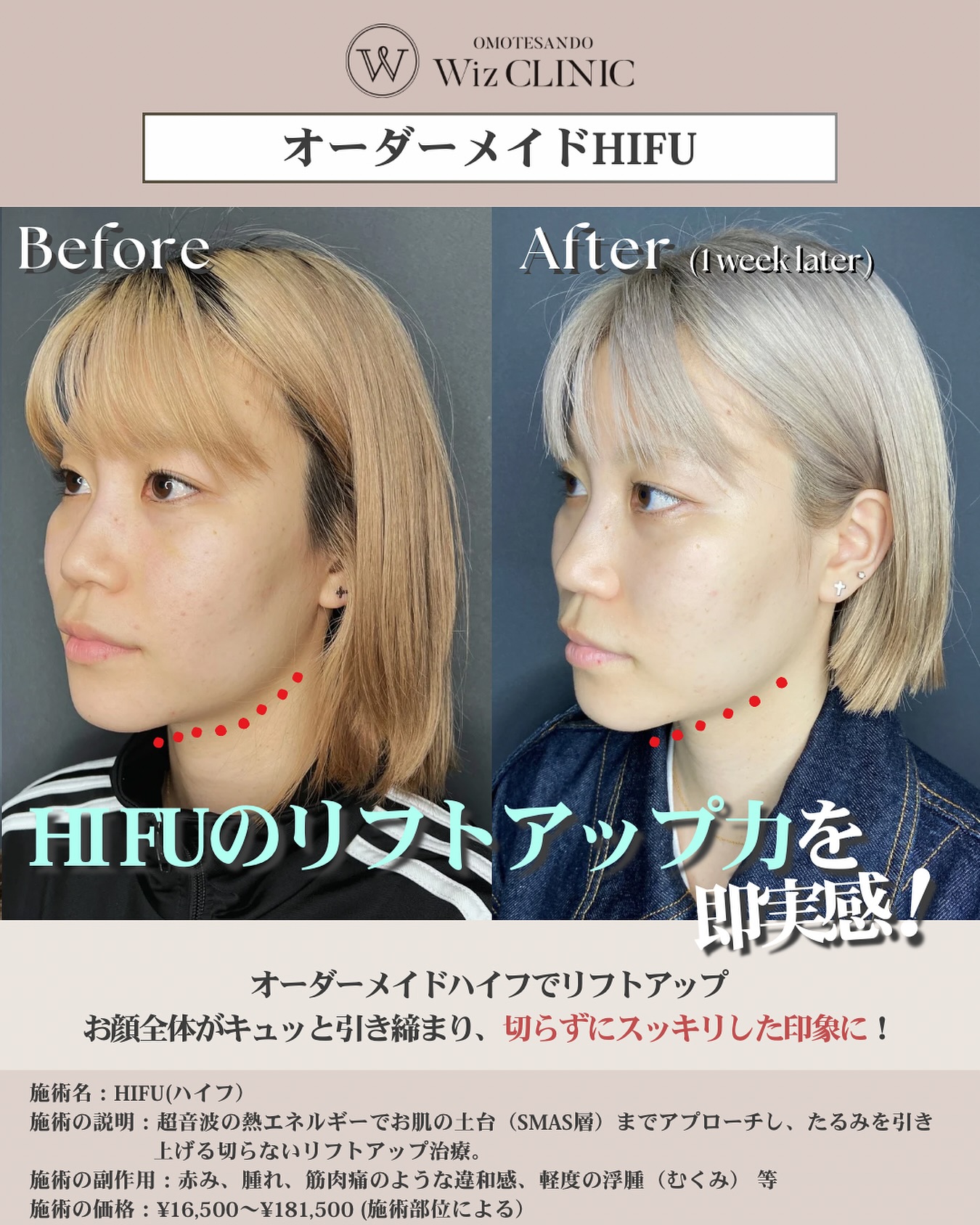 施術の説明:超音波の熱エネルギーでお肌の土台(SMAS層)までアプローチし、たるみを引き 上げる切らないリフトアップ治療。